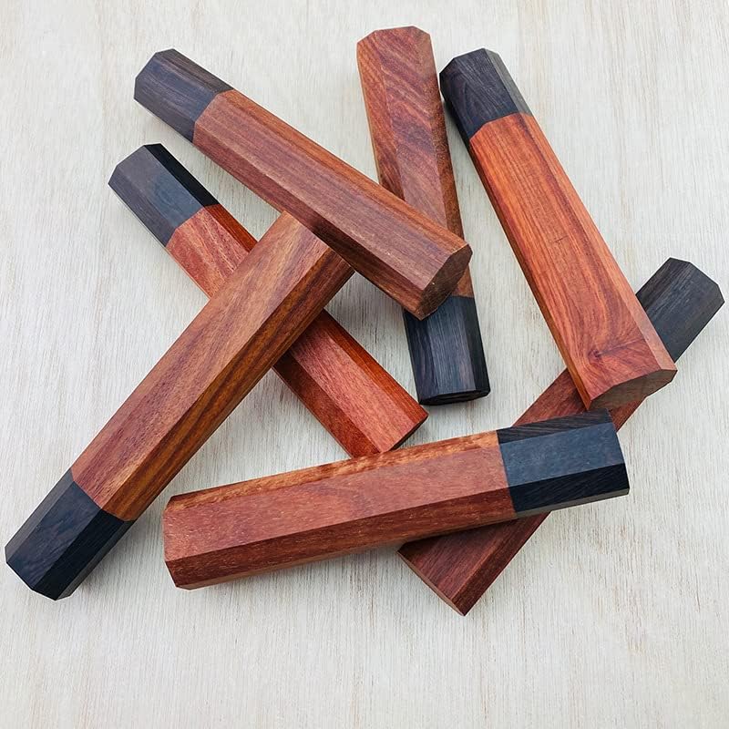Material: Bloodwood + Ebony (Purple Sandalwood)Size: total length 135MM, insertion depth of handle 70MM, tail 22*26MM, head 20.5*23.5MM, aperture 3.1*10.5MM(Before purchasing, please check whether the handle size matches your blade.)Net weight: only 60G/PCNote:1. The surface is made by CNC machinery. After receiving the goods, it needs to be polished with sandpaper and then polished with a rough wheel before use;2. Since the surface texture and color will change randomly, it cannot be guaranteed that the color of each octagonal handle is consistent with the picture. The actual object received shall prevail.