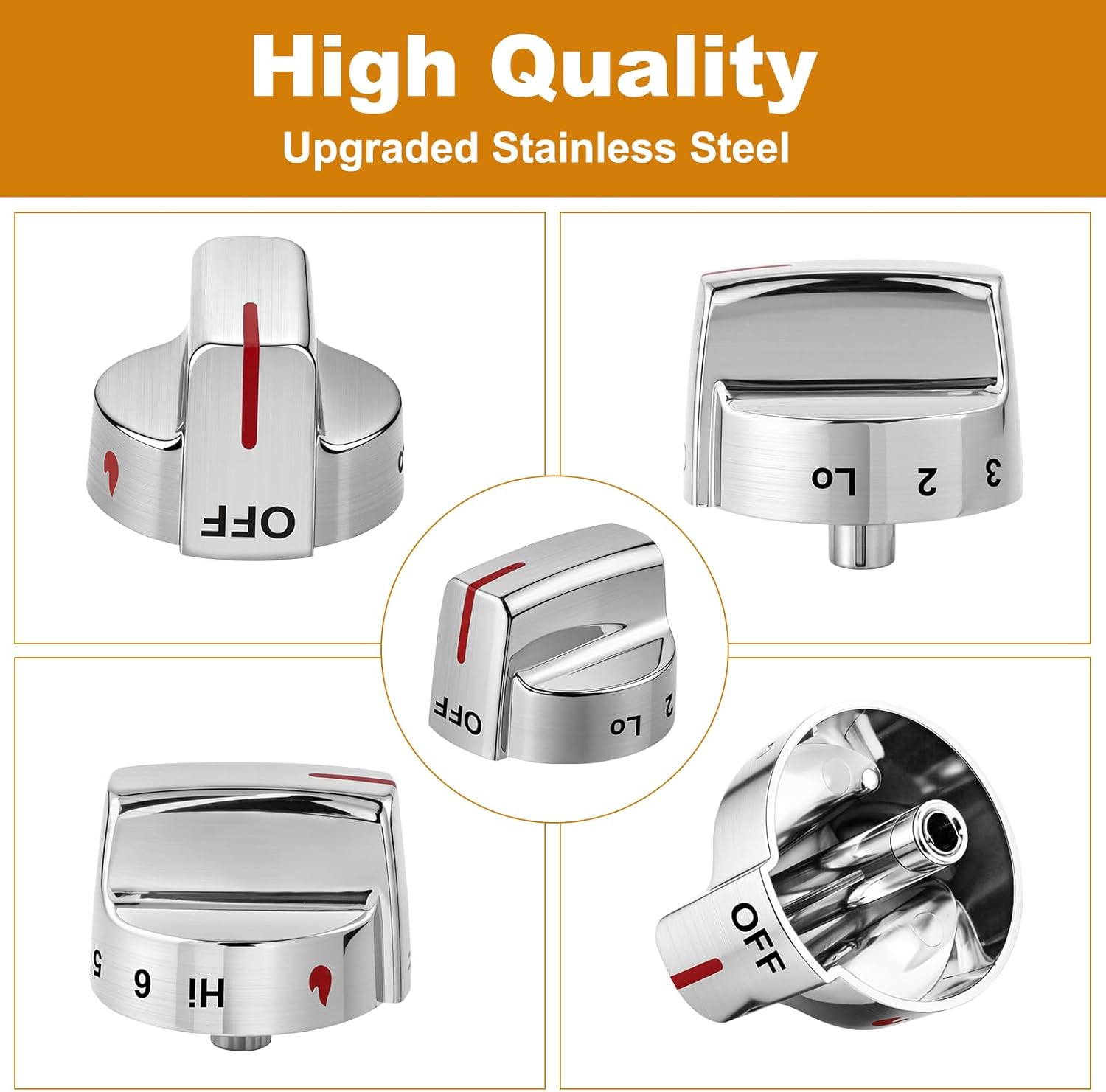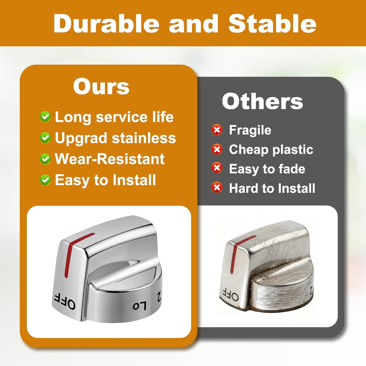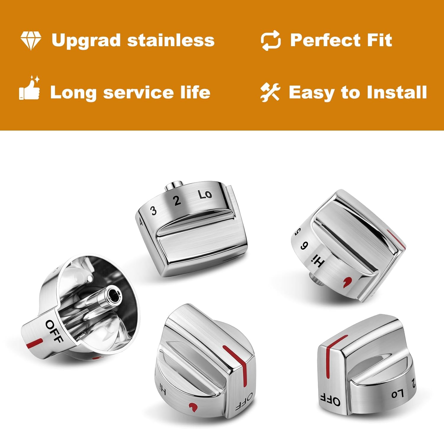Perfect Fit: Upgrade your Frigidaire appliance with our precise frigidaire gas stove knobs replacement set. Each knob measures 2.1" x 1.8", and the package includes 5 pieces for complete control replacement. Ensure a perfect match for your specific model without any hassle. Premium Material: Crafted from upgraded silver plastic, these frigidaire stove knobs offer enhanced durability, heat resistance, and a sleek aesthetic. They withstand high temperatures and daily wear for long-lasting performance in your kitchen. Durable Design: The internal sleeve on each gas stove knobs is made of tough plastic to prevent radial movement during use. This ensures reliable on/off cycles and resistance to heat and wear over time for consistent operation. Easy Install: Install these frigidaire gallery stove knobs in three simple steps: remove old knobs, align with the stem, and test functionality. No tools are needed for a quick and secure fit on your Frigidaire range, saving you time and effort. Wide Compatibility: These frigidaire oven knobs are designed as direct replacements for models like Frigidaire 5304509064 and many others. Check our list to ensure compatibility with your appliance for a seamless upgrade and peace of mind.