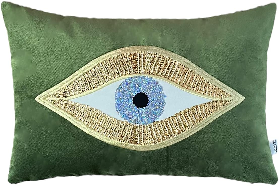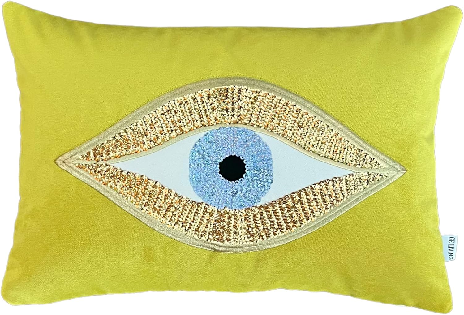 - Transform your living space with our Beige Velvet Evil Eye Throw Pillow Cover, a perfect blend of luxury, style, and cultural symbolism. This beautifully designed pillow cover features a captivating evil eye motif, adorned with shiny gold and blue sequins that are not only visually stunning but also believed to bring protection against negative energies and bad luck. Whether you’re looking to add a meaningful accent to your home or simply enhance your decor with a touch of elegance, this pillow cover is an excellent choice. - Crafted from premium-quality babyface velvet fabric, this cover offers a smooth and ultra-soft texture, creating a cozy and inviting feel. Measuring 14 x 20 inches (35 x 50 cm), it’s the ideal size to complement your couch, sofa, bed, or armchair. The neutral beige color effortlessly blends with a variety of home decor styles, from bohemian to modern chic, making it a versatile addition to any room.- Our evil eye pillow cover is designed with durability in mind. The sequins are securely stitched to ensure long-lasting beauty, even with regular use. A hidden zipper closure not only keeps the design sleek but also allows for easy removal, making cleaning and maintenance hassle-free. Please note: this listing is for the pillow cover only; the insert is not included.- Whether you’re redecorating your home, looking for a unique gift idea, or incorporating the symbolic evil eye into your living space, this decorative pillow cover is the perfect pick. Add a touch of elegance to your decor today!