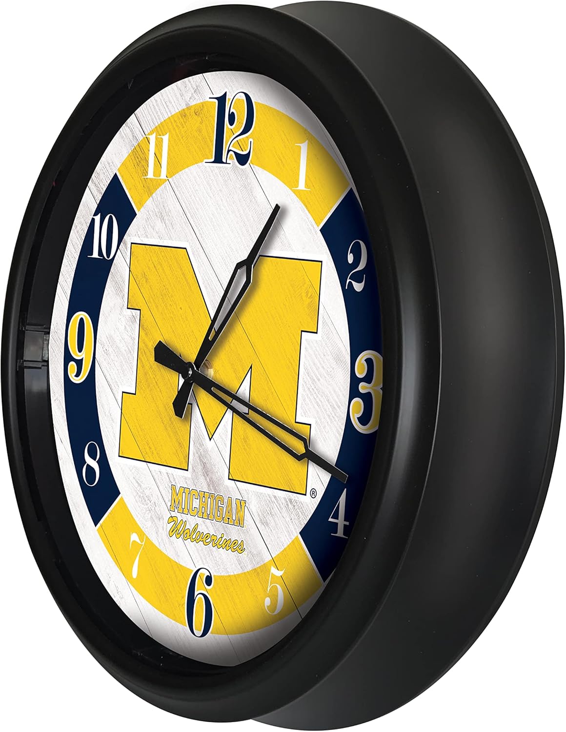 The Holland Bar Stool Co.’s indoor/outdoor LED Logo Clocks are the perfect way to show your school pride. These clocks are made to handle the outside environment. The casing is made from a UV resistant black ABS plastic and the glass face lens has a rubber gasket to seal the weather from the inner clock housing.Four LED lights are controlled by a photo eye, turning on automatically when it is dark to illuminate the clock face. LED lights run off 4 D batteries (not included). Art work is digitally printed with UV inks to ensure years of fade free, vibrant colors. Accurate quartz movement ensures proper time and is powered by a single, AA battery (not included). Whether purchasing as a gift for a recent grad, sports super fan, or for yourself, you can take satisfaction knowing you're buying a clock that is proudly brought to you by the Holland Bar Stool Company.