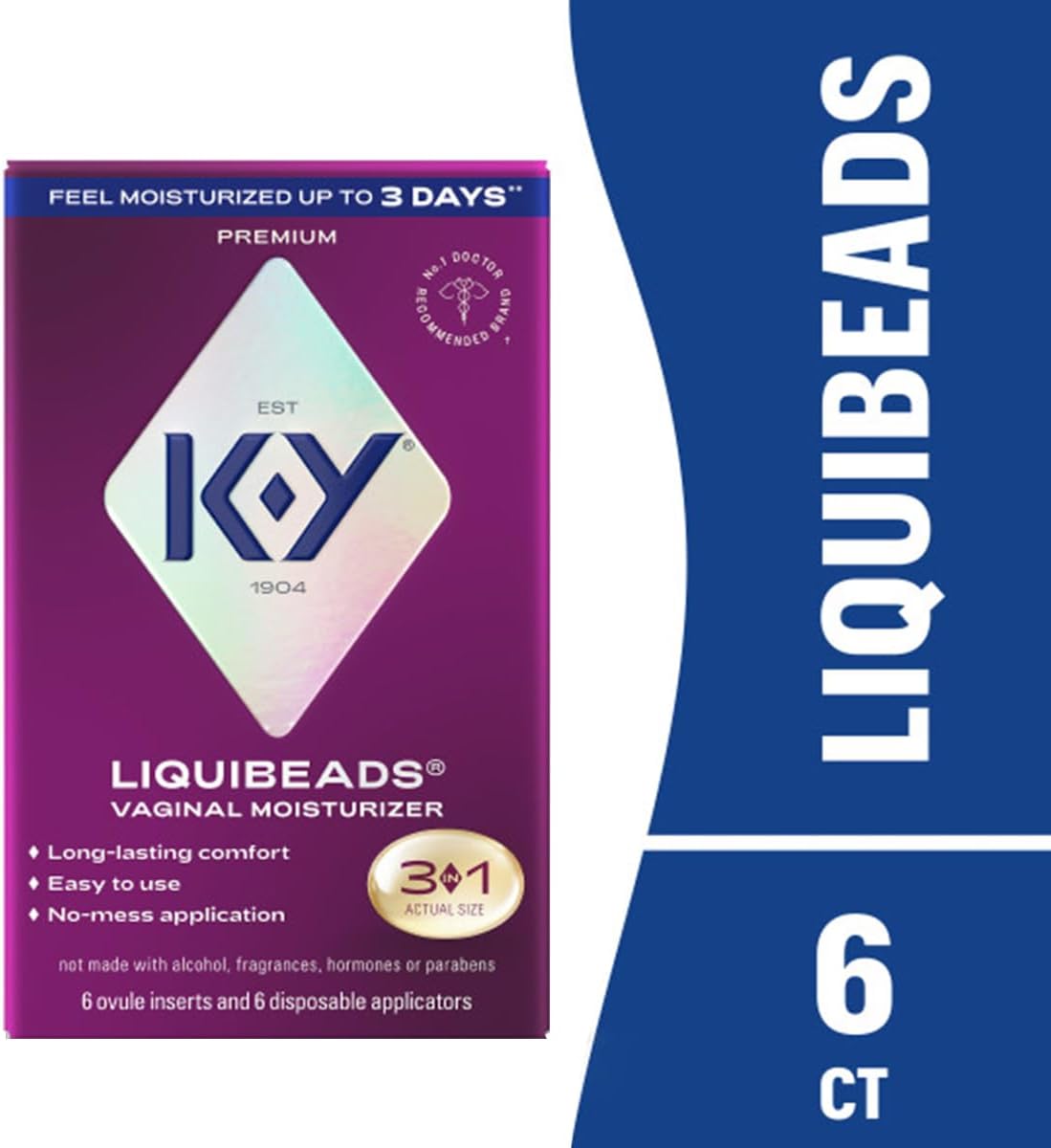 Vaginal dryness can be caused by many things, but it doesn’t mean you should stop having sex or have to endure painful sex. Let K-Y help rejuvenate your intimate life. K-Y Liquibeads are a silicone based vaginal moisturizer & lube that provide long-lasting comfort for better sex. This ovule insert has a less-mess formula that hydrates the intimate areas with the highest quality silicone so you are ready for sex when the mood strikes. After being inserted, the outer ovule begins to dissolve in minutes, gently releasing soothing lubrication to enhance your comfort. Designed to supplement the body's natural lubrication & feel like your own natural vaginal moisture. Specially formulated to keep you ready for intimacy & reduce discomfort due to vaginal dryness. K-Y Liquibeads vaginal lubricant are not made with alcohol, fragrances, hormones, or parabens. These vaginal suppositiories are easy to use & discreet so no one has to know you're using them. We know your vaginal care is no one else's business - that's why they're also delivered in discreet plain packaging, ensuring your comfort every step of the way. Our silicone-based formula is compatible with natural rubber latex, polyisoprene & polyurethane condoms. This product contains 6 ovule inserts & 6 disposable applicators. Say goodbye to messy, reusable vaginal cream applicators. K-Y is the #1 Doctor recommended personal lubricant brand*. *among vaginal lubricants & moisturizers, IQVIA, ProVoice Survey, Dec. 2023
