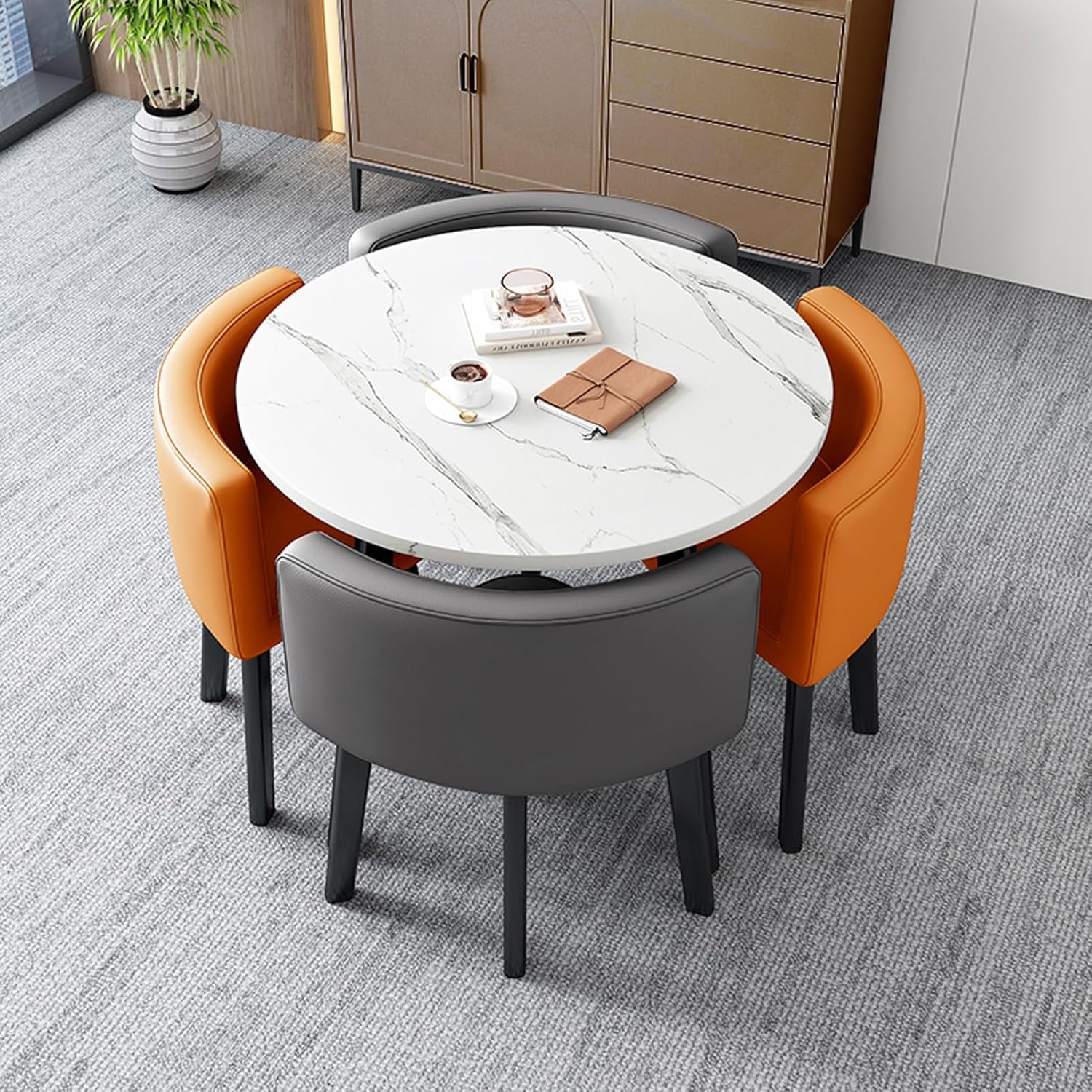 Modern & Natural Style - Designed in modern style, our conference table has elegant and beautiful appearance. It is perfect for your contemporary private or open-concept office space.Product Parameters:Product Name: Table and chair combinationFeatures: Simple, generous, space savingStyle: Simple and modernBracket structure Material: MetallTable shape: Round/squareDesk top material: E1 grade density boardTable top diameter: 80 cm/31.4 inchesChairs material: PU leather/FabricApplicable scenes: office, coffee shop, tea shop, reception, restaurant, library, cinema, clothing store, maternal and child shop, living room, etc.Applicable number: 4 peoplePacking method: assemblyPacking list:1*table,4*chairs (other things are decorations, not included)Warm Tips:1. Size Description: The product is completely measured by hand and may have an error of 1-3 cm. Please refer to the actual items received.2. Picture description: The product is real. Due to problems with light, angle, display, etc., there may be slight chromatic aberration, please forgive me.