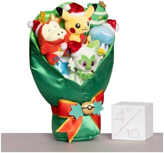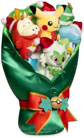 Forget flowers—a bouquet of tiny Pokémon plush dressed in their holiday best is sure to bring joy to the heart! The plush wrap for the bouquet is secured with a bow and jingle bell for extra festive fun.Plush are not removeable: they are sewn to the bouquetIncludes Pikachu, Sprigatito, Fuecoco, and QuaxlyFeatures soft material with embroidered detailsPart of the Pokémon Holiday Festival collectionPokémon Center OriginalItem Dimensions: 6.1 x 9.8 x 15.8 INItem Weight: 16.2 OZ