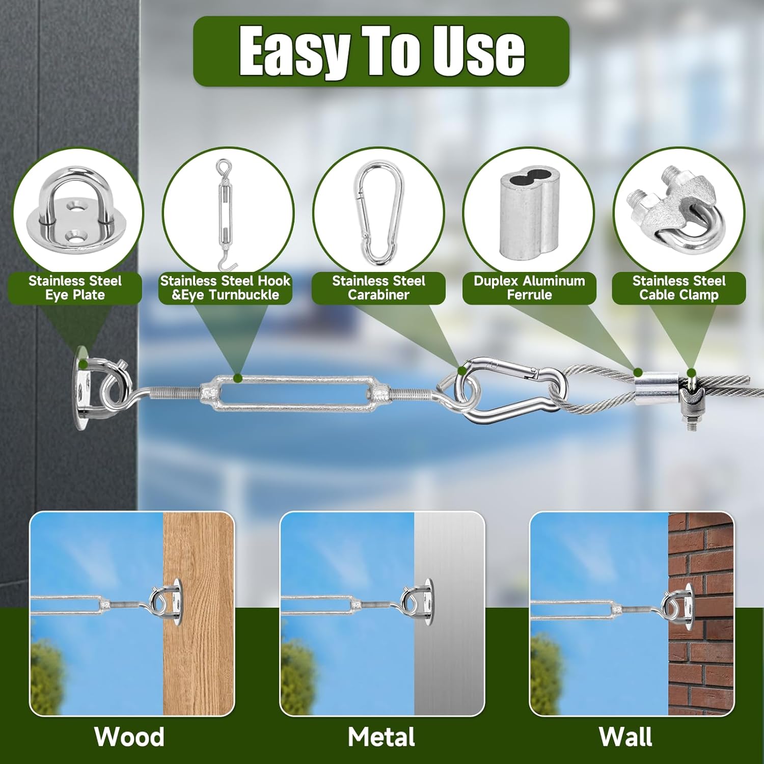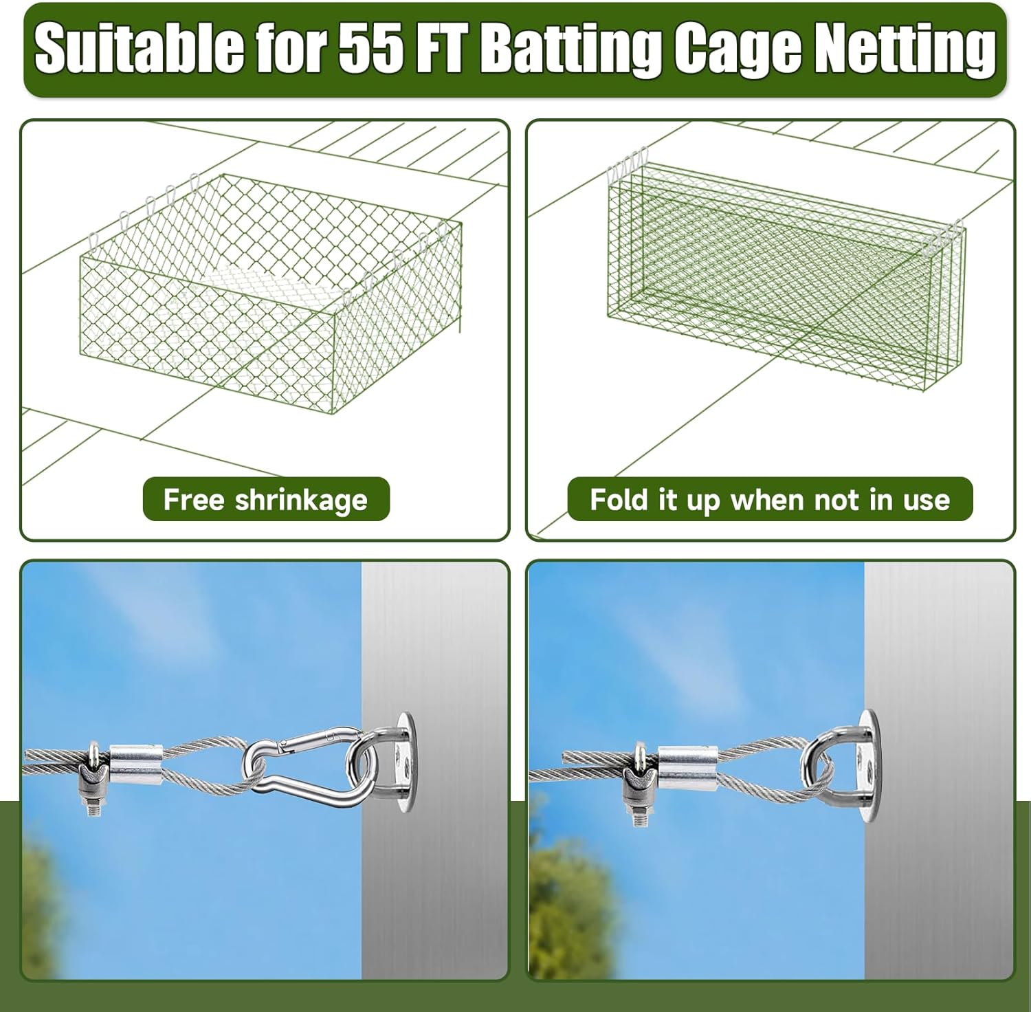 | Included Components | 165 stainless steel snap hooks and matching stainless steel and galvanized fittings, 230 feet of wire rope |