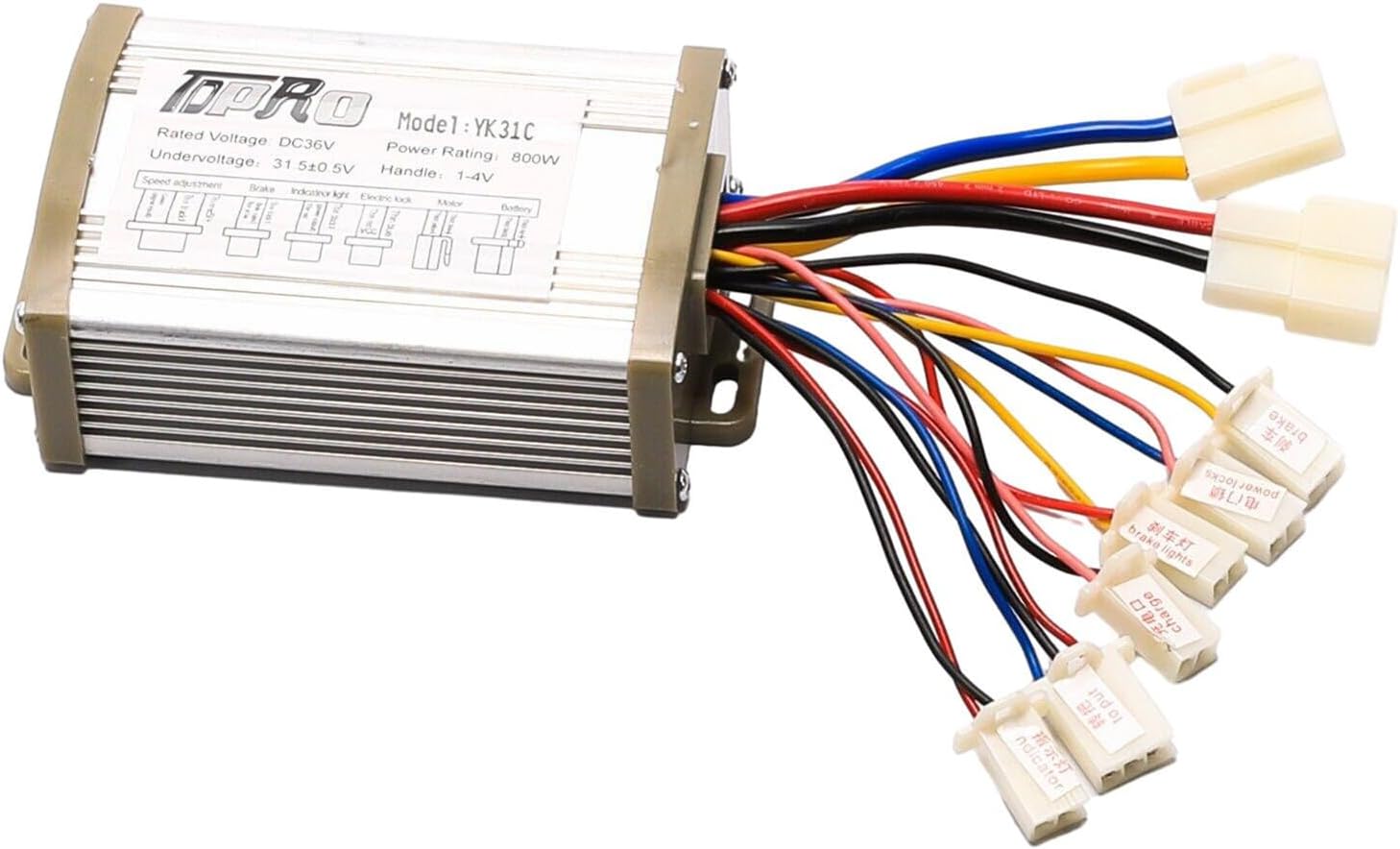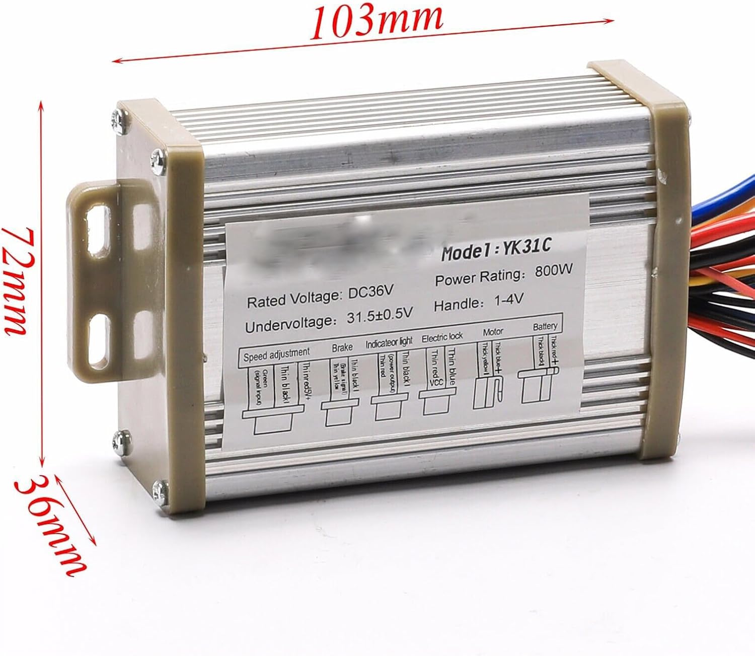 Controller: Works on 36V, 800W scooters and electric bikes Type: brush speed controller Voltage: 36V Wattage: 800W Casing material: aluminium Colour: silver Dimensions: 122 x 97 x 50mmThrottle pedal Universal 12v 24v 36v 48v Black Electric Scooter Bike Throttle pedal Beautiful outlook and modern design. Throttle Control Set Three Pin Suit for Electric Throttle,Motorcycle,Scooter.Specification: Style: striae & Round Operating voltage: 5V Adjustment range: Minimum ?1.0V; highest ?4.0V Function: high, medium and low grades governor