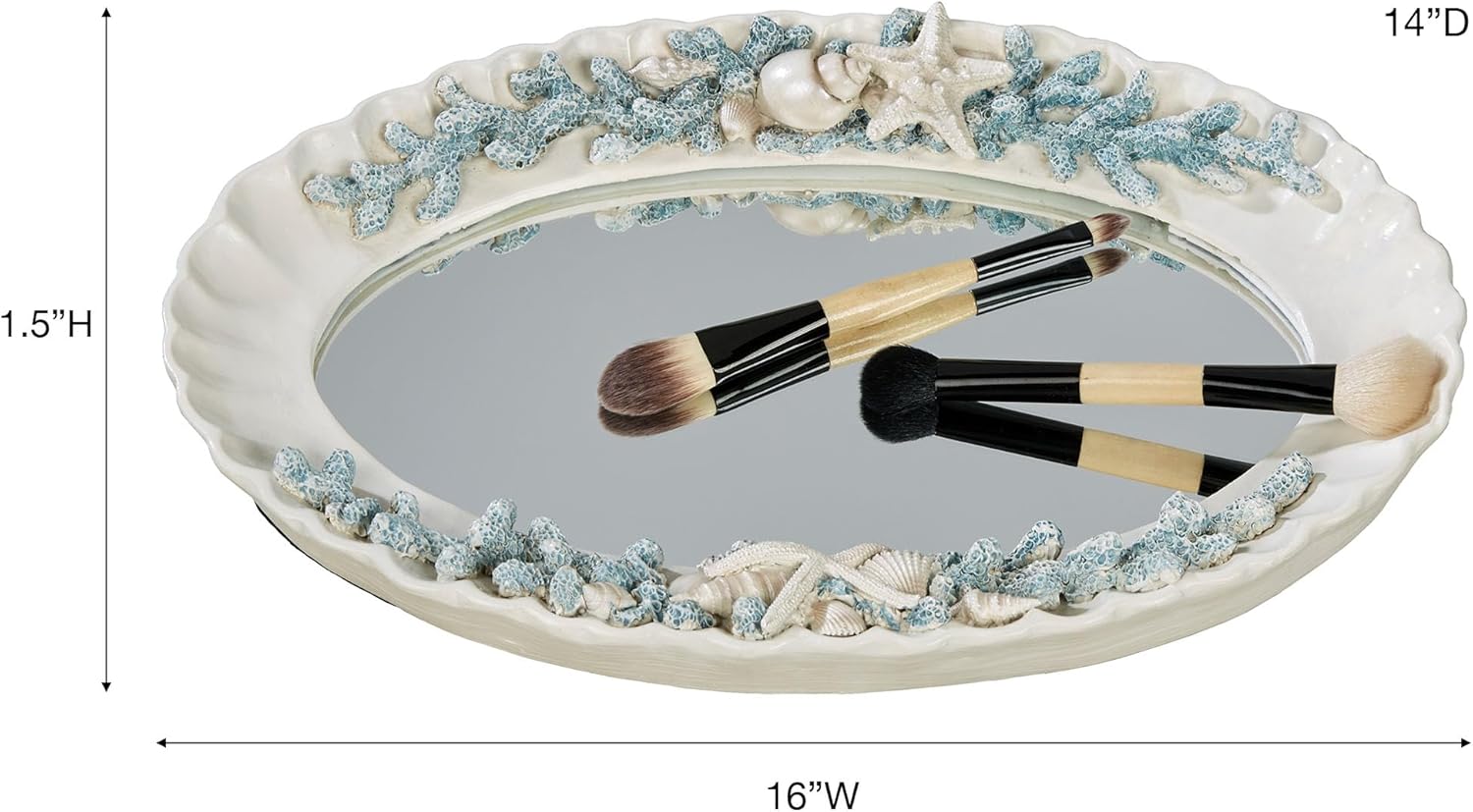 The Coral Treasures Mirrored Vanity Tray will add undersea majesty to your space. Handpainted in blue and ivory, the coastal resin tray features beautiful shells, starfish, and coral. Vanity tray has a mirrored glass bottom. Measures 16 Wx14 Dx1.5 H. Designed by Touch of Class(R)! Coastal mirrored vanity tray Handpainted in blue and ivory Beautiful undersea designs.