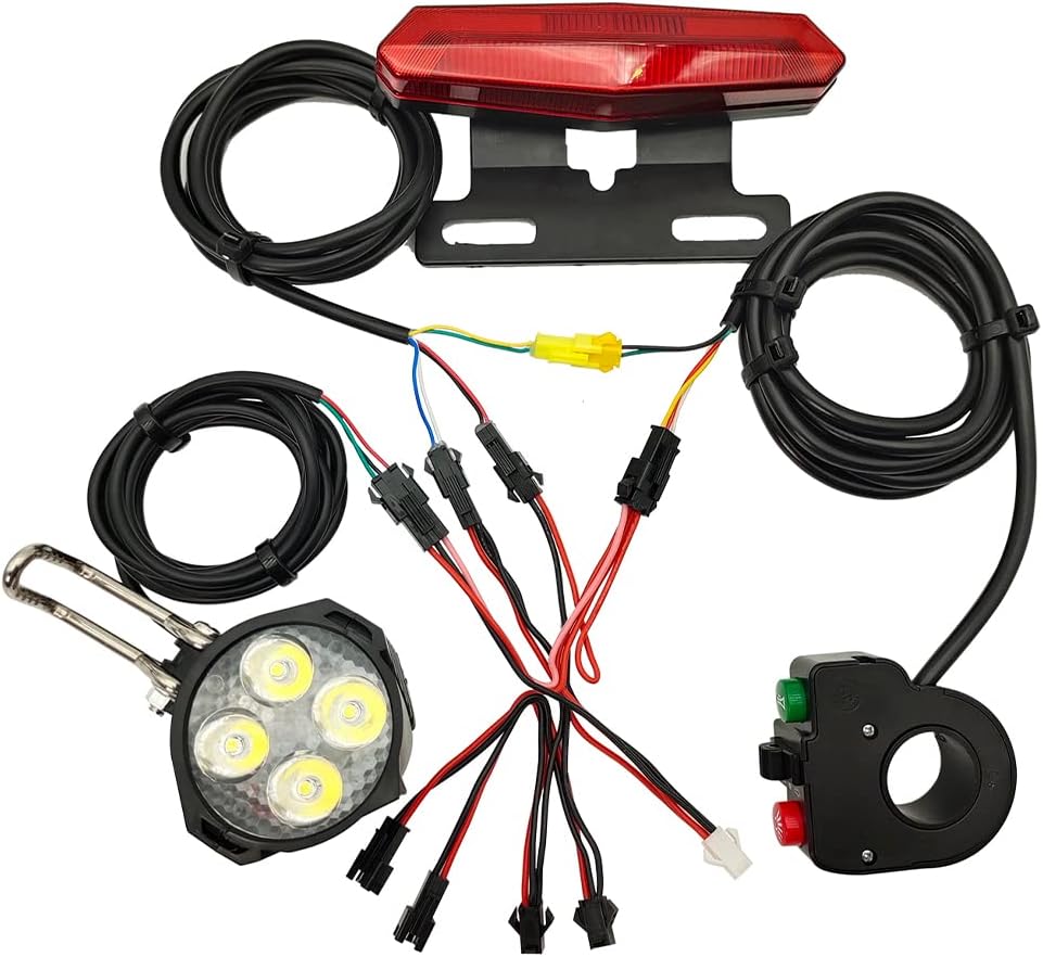Application: Suitable for any ebike system with SM plug (Less than 60V) electric bicycles Function: Driving lights: When the switch of driving lights is turned on, the headlights and tail lights are onHorn: When the horn button is pressed, the horn starts to work, release it to cancel Brake light: When the brake signal line and the controller brake low voltage signal are connected normally, the brake light will light up while braking, and the brake light will go out when the brake is cancelled Turn signal: When the turn switch of the designated direction is toggled, the turn signal of the corresponding direction starts to work and flashes, the flashing frequency is about 800ms each time Front Light Parameters: Applicable voltage: 24V-60V Light Power: 12W Shell material: plastic Power:59mA/2.8W Luminous flux: 180-220LM Horn Power: 44mA/2.1WHorn Volume: 80-100dB Product size: 62*50*70mm Cable length: about 1.5M Taillight parameters: Net weight of taillight: 120g Shell material: plastic Applicable voltage range: 24-80V Power: 1.5W Number of light sources: 14 Luminous flux: 15LM Product size: 132*65*40mm Cable length: about 1.5M Switch parameters: *1. Net weight of switch: 92g *2. Shell material: plastic *3.Product size: 26*53*61mm *4.Cable length: about 1.5M*5. Wiring: -White: driving light output+ -Red: power input+ -Yellow: horn output+ Wiring of lamp group: *1. Net weight: 13 g *2. Size: 22AWG *3. Length: 140 mm(folded)Note: 1. The real color of the item may be slightly different from the pictures shown on website caused by many factors such as brightness of your monitor and light brightness. 2. Please allow slight manual measurement deviation for the data.